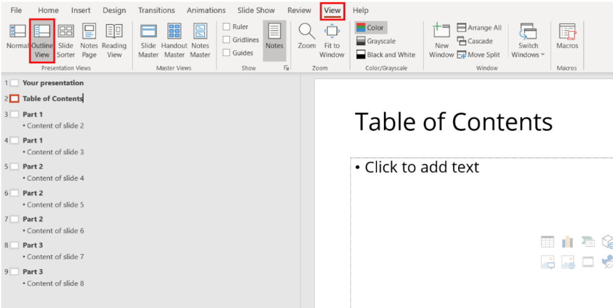 outline view - see onl heading for each slide view > outline view > right click > collaspe all