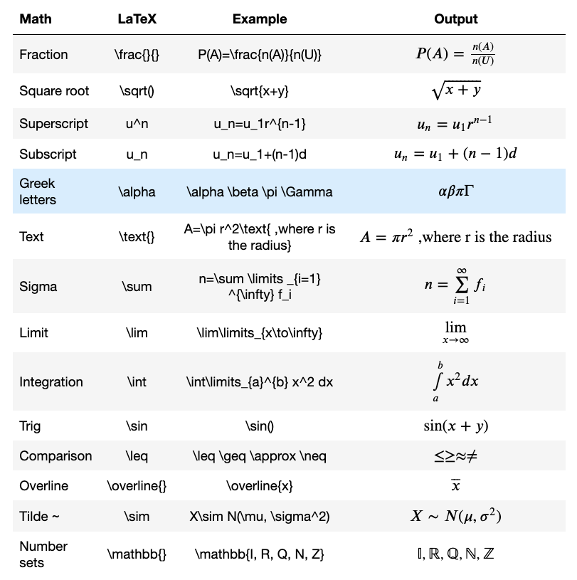 | Greek letters | \alpha \beta \pi \Gamma | \(\alpha\) |